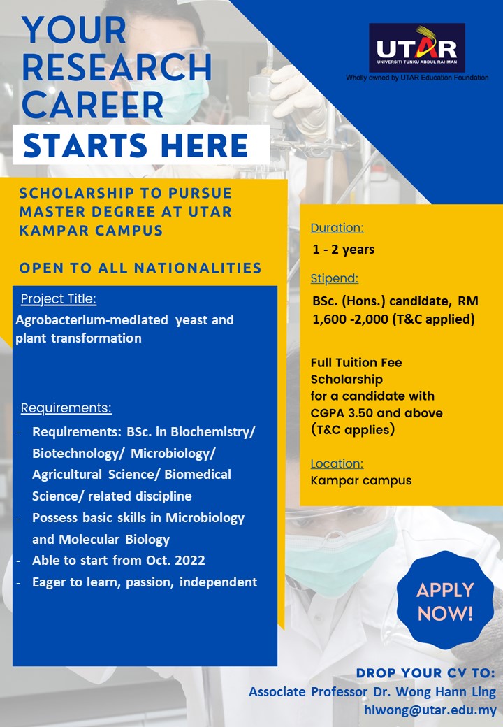 | Job Description | Moleent plant transformation. Start from Sept./Oct 2022. Apply to Dr. Wong Hann Ling (hlwong@utar.edu.my).cular cloning, PCR, RT-PCR, recombinant protein expression, yeast transformation, and transient plant transformation |